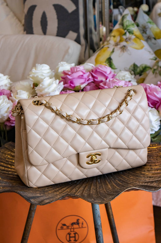 Chanel - Jumbo Classic Doppelklappe Tasche aus Lammfell in Beige