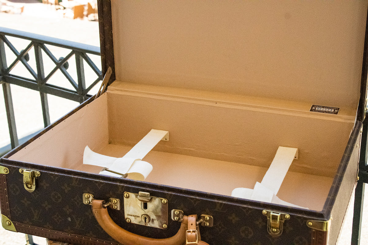 Hergestellt aus hochwertigem, robustem Material und mit der charakteristischen LV-Monogramm-Prägung versehen, strahlt der Louis Vuitton Reisekoffer einen Hauch von Vintage-Charme aus. Die fein gearbeiteten Details, wie die ikonischen Lederbesätze und die goldfarbenen Metallbeschläge, verleihen dem Koffer eine zeitlose Anmutung.